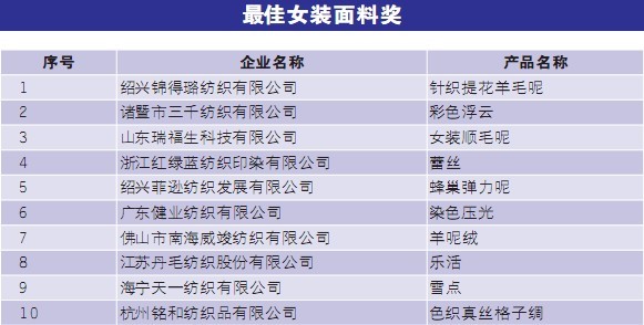產品征集階段結束后,由國內知名服裝企業采購商代表組成的專業評審小組對產品在工藝、設計、市場暢銷度、性價比等項指標進行了專業評價,最后將用戶評價和專家評價加權平均,產生最終獎項。本年度共有48家企業摘得“中國面料之星”榮譽。