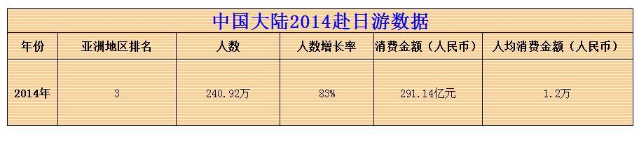 2015年國慶期間,有400萬內地的中國人赴日旅游,人均消費1.5萬人民幣;而就在10月1日,盛大的紀念抗戰勝利70周年國慶閱兵剛剛結束。這讓很多人深感疑惑,難道國人如此之快地忘記了日本當年給中華民族帶來的苦難了嗎?更重要的是,2015年大陸中國人赴日熱情猛漲并非突發案例,因為在2014年,中國大陸赴日游人數高達240.92萬人,比2013年增長了83%,在日本消費了291.14億元人民幣。如下表所示: