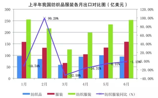 從今年上半年紡織服裝出口情況看,除1、2月受春節(jié)影響出口大幅波動(dòng)外,3月起已經(jīng)連續(xù)4個(gè)月下跌,但跌幅正不斷收窄,6月紡織服裝出口跌幅已收窄到1.13%。