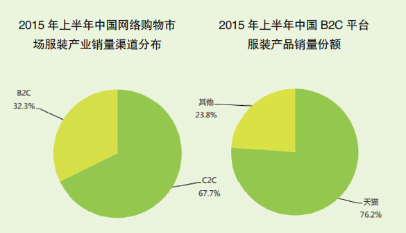2015上半年中國服裝類產品C2C渠道銷量占比為67.7%,占有服裝網購主流地位。這主要是C2C平臺上服裝的多樣性和低價等因素共同作用的結果。