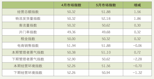 從6個(gè)分項(xiàng)指數(shù)看,5個(gè)指數(shù)均有所上升,其中經(jīng)營(yíng)總額及物流發(fā)貨量指數(shù)回升明顯。5月經(jīng)營(yíng)總額指數(shù)51.88,較4月上升1.56個(gè)百分點(diǎn);物流發(fā)貨量指數(shù)52.18,較4月上升1.86個(gè)百分點(diǎn);電商銷售指數(shù)達(dá)到51.88,與上期的51.94基本持平。值得注意的是,5月開門率指數(shù)為49.68,4月為49.36,連續(xù)兩個(gè)月位于榮枯線以下。
