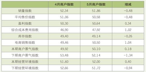 從分項(xiàng)指數(shù)來(lái)看,5月綜合成本費(fèi)用指數(shù)47.92,比4月的46.90上升1.02個(gè)百分點(diǎn),成本壓力一定程度上得到緩解;但成本費(fèi)用指數(shù)仍遠(yuǎn)低于50分界線,商戶成本壓力依然較大;電商銷售指數(shù)50.50,比4月的49.46上升1.04個(gè)百分點(diǎn),對(duì)商戶經(jīng)營(yíng)狀況好轉(zhuǎn)產(chǎn)生積極影響。