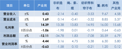 分領域看,1-9月非織造布規模以上企業的營業收入和利潤總額分別同比下降2.1%和34.8%,營業利潤率為3.2%,同比下降1.6個百分點;繩、索、纜規模以上企業的營業收入同比下降0.4%,利潤總額同比增長1.8%,營業利潤率為4.8%,同比增長0.1個百分點;紡織帶、簾子布規模以上企業的營業收入和利潤總額分別同比下降3.5%和7.1%,營業利潤率為5.4%,同比下降0.2個百分點;篷、帆布規模以上企業的營業收入和利潤總額分別同比增長9.7%和35.6%,6.3%的營業利潤率為行業最高水平;過濾、土工用紡織品所在的其他產業用紡織品規模以上企業的營業收入和利潤總額分別同比增長4.6%和6.8%,營業利潤率為5.8%,同比增長0.1個百分點。