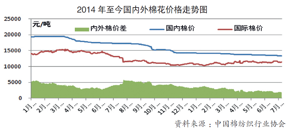 基于當(dāng)前國(guó)內(nèi)走弱的棉花市場(chǎng),企業(yè)普遍認(rèn)為儲(chǔ)備棉價(jià)格偏高。今年上半年,紡紗市場(chǎng)形勢(shì)低迷,國(guó)內(nèi)棉花價(jià)格始終處于下行通道,儲(chǔ)備棉輪出只是堅(jiān)定了企業(yè)減少棉花庫(kù)存的判斷。而國(guó)際棉價(jià)自二季度開(kāi)始震蕩攀升,與國(guó)內(nèi)棉花價(jià)差逐漸縮小至不足2000元/噸。國(guó)際棉價(jià)上行,一是受全球棉花產(chǎn)量下降預(yù)期的影響,二是美元走強(qiáng)的同時(shí),大宗農(nóng)產(chǎn)品價(jià)格普遍上漲,但未來(lái)國(guó)際棉價(jià)是否能繼續(xù)堅(jiān)挺上行仍為未知數(shù)。