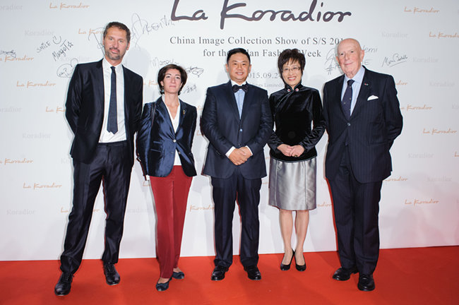 國際時尚泰斗意大利全國時尚協(xié)會、米蘭時裝周名譽主席Mario Boseli先生(右一)、米蘭市副市長Cristina Tajani女(左二)、中國駐米蘭領(lǐng)事館總領(lǐng)事王冬女士(右二)、珂萊蒂爾股份有限公司董事長金明先生(中)合影