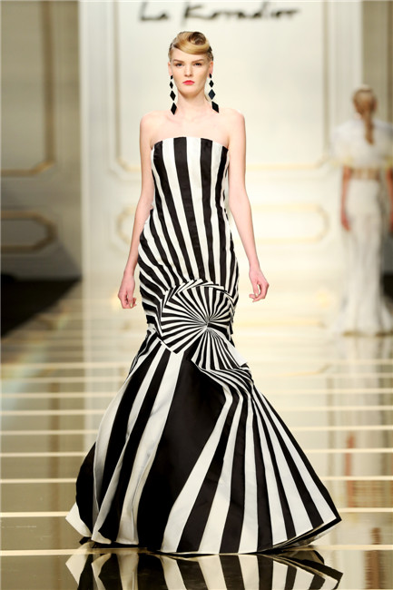 中國時尚獻禮——La Koradior中國映像主題系列華美發(fā)布 此次大秀有四大系列共55套精美服飾,主要由La Koradior(拉珂蒂)來自意大利和中國的七位設(shè)計師共同完成。 第一系列:韻味中國 迤邐曲線 靈感來源于被譽為“地球最美曲線”的梯田和山巒,設(shè)計師們運用歐根紗、PVC亮片、雪紡的巧妙結(jié)合,表現(xiàn)梯田的疊層結(jié)構(gòu);運用土黃色和巖石灰色的過渡漸變表現(xiàn)山巒在日月光影下的綺彩變幻。