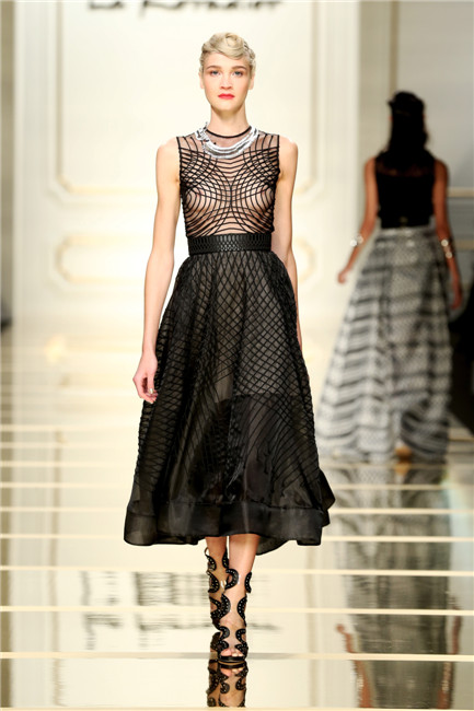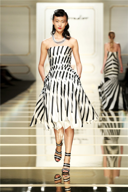 第四系列:摩登中國 黑白風(fēng)尚 設(shè)計師在獨特圓形土樓和現(xiàn)代幾何結(jié)構(gòu)的水立方等古今建筑中汲取靈感,采用極簡黑白色調(diào)和流暢縱橫的幾何線條,制作而成的黑白時裝,充滿現(xiàn)代感和未來感。