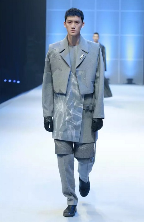 金獎作品 當最終金獎敲定之時,賽場內,胡欣逸的“助威團”爆發出了雷霆般的歡呼聲,也將大賽帶入了最高潮。賽后胡欣逸在接受《紡織服裝周刊》記者采訪時表示:“借助大賽我證明了自己,也堅定了自己未來設計師的職業選擇,這筆豐厚的獎金將用于未來的深造。”賽后他希望自己能有機會進入著名設計師的工作室實習,進一步豐富自己的設計理念,提高設計能力。