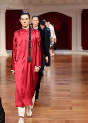 北洋軍閥時期的華麗軍裝形制簡便,精致洋裝充滿活力,清末貴族裘皮服飾再度重現傳統風姿,一場服飾變革席卷而來。細節方面絲毫不馬虎,中國傳統蘇繡、勾邊刺繡、米珠刺繡等技藝運用于絲絨、真絲重緞、毛呢等面料之上。 第二幕,五四運動,民族覺醒。