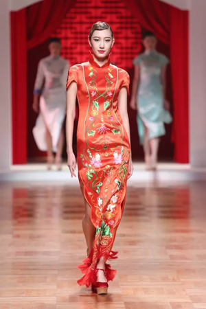 這一系列作品結合西式立體剪裁技術,改變了傳統的平直造型,色彩也更為淡雅,以黑、白、灰、粉為主基調,點綴水藍、湖綠、朱紅。