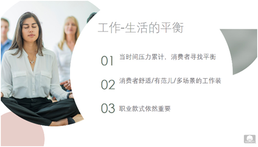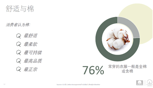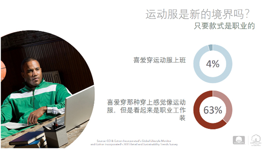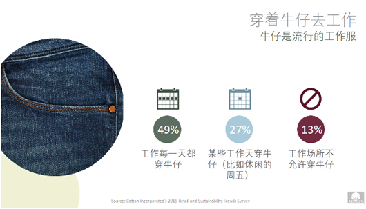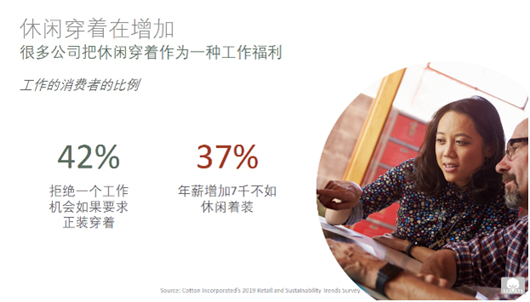 1. 工作與生活平衡 根據(jù)美國(guó)棉花公司2019零售和可持續(xù)趨勢(shì)調(diào)查,55%的中國(guó)消費(fèi)者表示因?yàn)槊刻毂仨氉龅哪切┦赂械健俺瑯O壓力”,64%的中國(guó)消費(fèi)者表示白天沒(méi)有時(shí)間去做需要/想要做的事情。在全球經(jīng)常感到疲憊不堪的比例高達(dá)54%。因此,許多公司為減輕員工壓力,把允許休閑穿著作為一種工作福利。同樣根據(jù)前述提到的趨勢(shì)調(diào)查,42%的中國(guó)消費(fèi)者拒絕一個(gè)需要穿著正裝的工作機(jī)會(huì)。牛仔正變得越來(lái)越流行,49%的中國(guó)消費(fèi)者每天都穿著牛仔褲工作,27%允許在某些工作日穿著牛仔(例如周五)。消費(fèi)者認(rèn)為,樂(lè)于穿著牛仔工作的原因是舒適,多樣性,時(shí)尚和功能性。另一個(gè)在工作場(chǎng)合受到消費(fèi)者歡迎的是,職業(yè)款式的運(yùn)動(dòng)服裝。63%的中國(guó)消費(fèi)者喜愛(ài)穿著感覺(jué)像運(yùn)動(dòng)服裝,但是看起來(lái)是職業(yè)工作裝。此外,根據(jù)美國(guó)棉花公司和美國(guó)國(guó)際棉花協(xié)會(huì)的全球生活方式調(diào)查,76%的中國(guó)消費(fèi)者常穿的服裝一般是全棉或含棉。他們認(rèn)為棉是最舒適,最柔軟,最可持續(xù)和品質(zhì)最好的。