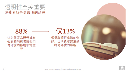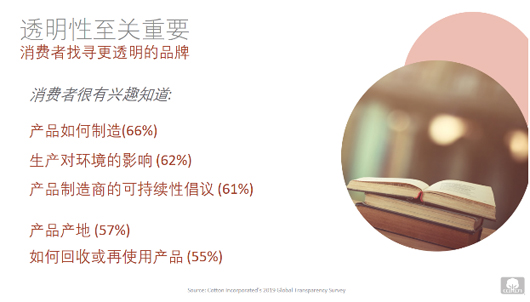 根據(jù)美國(guó)棉花公司2019全球透明性調(diào)查,88%的中國(guó)消費(fèi)者認(rèn)為服裝品牌開(kāi)誠(chéng)布公的和消費(fèi)者就他們對(duì)環(huán)境的影響非常重要,僅13%的消費(fèi)者相信服裝行業(yè)做的很好,讓消費(fèi)者知道品牌對(duì)環(huán)境的影響。消費(fèi)者找尋更透明的品牌,消費(fèi)者很有興趣知道,產(chǎn)品如何制造(66%),生產(chǎn)對(duì)環(huán)境的影響(62%),產(chǎn)品制造商的可持續(xù)倡議(61%),產(chǎn)品產(chǎn)地(57%),如何回收或再使用產(chǎn)品(55%)。關(guān)于產(chǎn)品回收,自2006年起,美國(guó)棉花公司發(fā)起B(yǎng)LUE JEANS GO GREEN?項(xiàng)目,通過(guò)該項(xiàng)目收集牛仔布,將其從垃圾填埋場(chǎng)轉(zhuǎn)移,并與Bonded Logic,Inc.合作,將其回收為UltraTouch?牛仔絕緣材料。每年,這些絕緣材料被分發(fā)到美國(guó)各地以幫助建筑工作。至今,已經(jīng)收集了近250萬(wàn)條牛仔褲,從垃圾填埋場(chǎng)轉(zhuǎn)移了超過(guò)1230噸紡織廢品。