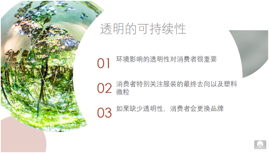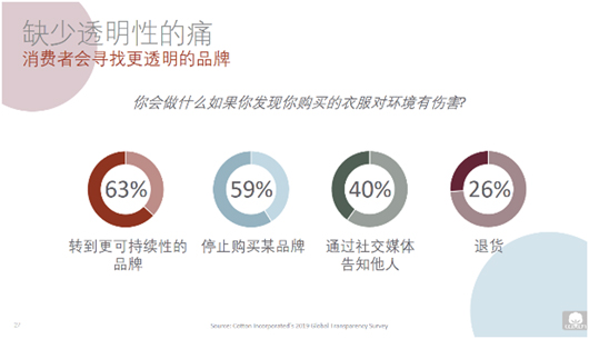 近年來(lái)塑料微粒污染是大家熱議的話題,根據(jù)2019零售與透明性趨勢(shì)調(diào)查,38%的中國(guó)消費(fèi)者意識(shí)到塑料微粒污染,67%的中國(guó)消費(fèi)者表示會(huì)影響自身購(gòu)買。如果發(fā)現(xiàn)購(gòu)買的衣服對(duì)環(huán)境有傷害,63%的中國(guó)消費(fèi)者會(huì)轉(zhuǎn)向更可持續(xù)的品牌。59%的消費(fèi)者會(huì)停止購(gòu)買該品牌。40%的消費(fèi)者會(huì)通過(guò)社交媒體轉(zhuǎn)告他人。26%的消費(fèi)者選擇退貨。因此可見(jiàn),環(huán)境影響的透明性對(duì)消費(fèi)者很重要,消費(fèi)者特別關(guān)注服裝的最終去向和塑料微粒話題的動(dòng)向。如果品牌缺乏透明性,消費(fèi)者可能會(huì)更換品牌。