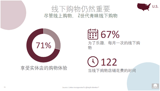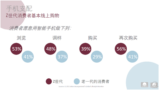根據(jù)歐睿的調(diào)查報(bào)告,網(wǎng)上服裝消費(fèi)持續(xù)增長(zhǎng),到2018年全球線上服裝銷售達(dá)2690億美元。而Z世代絕對(duì)是移動(dòng)的一代,他們基本線上購(gòu)物。根據(jù)美國(guó)棉花公司和美國(guó)國(guó)際棉花協(xié)會(huì)的全球生活方式調(diào)查,中國(guó)Z世代消費(fèi)者愿意使用智能手機(jī)做下列:瀏覽(53%),購(gòu)買(39%),再次購(gòu)買(56%)。他們也更愿意通過(guò)社交媒體獲得著裝理念,更喜歡擁有AI個(gè)性化購(gòu)物體驗(yàn)的品牌。然而,線下購(gòu)物對(duì)Z世代依然重要。根據(jù)美國(guó)棉花公司生活方式調(diào)查,71%的美國(guó)Z世代消費(fèi)者享受實(shí)體店的購(gòu)物體驗(yàn)。他們認(rèn)為線下購(gòu)買服裝更方便,快捷,享受到品牌提供的客戶服務(wù)。