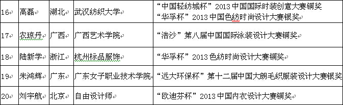 “迪尚G.Revive”第十屆中國時裝設(shè)計大賽成果獎評選初評活動于6月18日在北京舉行。經(jīng)過專家評委多倫篩選和審定,共有20位選手從眾多作品中脫穎而出,進入終評。 “迪尚G.Revive”第十屆中國時裝設(shè)計大賽成果獎評選由中國服裝設(shè)計師協(xié)會與迪尚集團共同主辦,獲得本屆的參評資格的為2013-2014年度全國(國際)時裝設(shè)計大賽的金、銀、銅(一、二、三)獲獎?wù)?。參評選手圍繞“流行”、“趨勢”關(guān)鍵字,完成2016春夏休閑時裝流行趨勢提案。中國時裝設(shè)計“金頂獎”獲得者武學(xué)偉、劉薇及十佳時裝設(shè)計師鄒游等設(shè)計權(quán)威擔任評委,為入圍作品把關(guān)。 終評活動將在2015年10月下旬在梅賽德斯-奔馳中國國際時裝周(2016春夏系列)期間舉行。今年迪尚大獎得到了迪尚旗下品牌北京G.Revive潮流個性女裝的大力支持,G.Revive女裝將協(xié)同本次成果獎并在時裝周上做精彩的發(fā)布會展示。 迪尚G . Revive”第十屆中國時裝設(shè)計大賽成果獎入圍名單