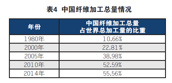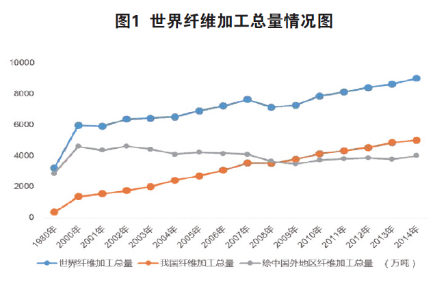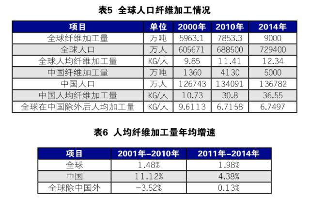 全球人均纖維加工量,2000年是9.85千克/人,2010年是11.41千克/人,2014年是12.34千克/人;中國人均纖維加工量,2000年是10.73千克/人,2010年是30.8千克/人,2014年是36.55千克/人。在中國之外的全球人均纖維加工量,2000年是9.61千克/人,2010年是6.72千克/人,2014年是6.75千克/人,中國人均纖維加工量與世界扣除中國之外的人均纖維加工量之比分別為:2000年是1.12倍,2010年是4.59倍,2014年大約是5.42倍。這既是我國纖維加工產(chǎn)業(yè)發(fā)展的巨大成就,同時也是新時期中國纖維加工產(chǎn)業(yè)升級的重要基礎(chǔ)和發(fā)展?jié)摿λ凇?