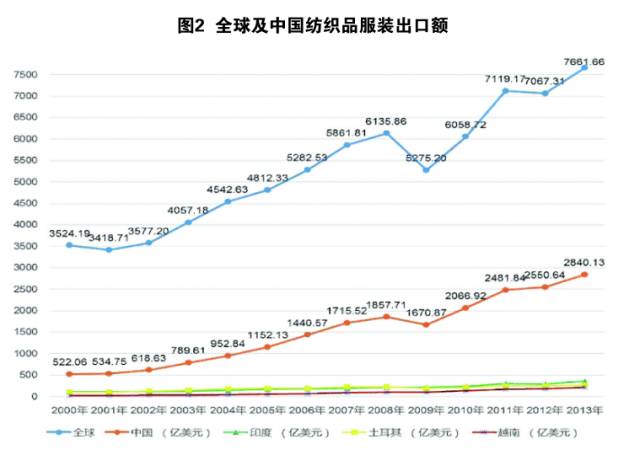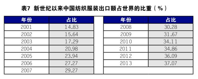(2)作為世界第一大紡織服裝出口國的競爭優(yōu)勢明顯。2000年中國紡織品服裝出口額占世界14.81%,2008年上升到30.28%,2013年繼續(xù)上升到37.07%。