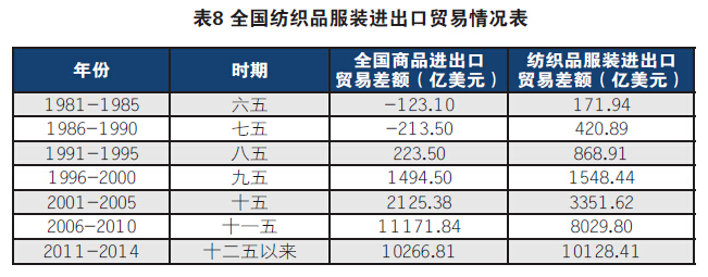 (3)紡織品服裝出口貿(mào)易順差對全國國際收支平衡貢獻最大。從1981到2014年全國貨物貿(mào)易累計順差24945.43億美元,其中紡織服裝累計順差24810.01億美元,占全國99.46%。 “六五”期間,全國商品進出口貿(mào)易逆差123億美元,紡織品服裝進出口貿(mào)易順差171.94億美元,扣除紡織部分全國則是逆差295億美元;“七五”期間,全國貿(mào)易逆差213.5億美元,紡織品服裝貿(mào)易順差420.89億美元,扣除紡織服裝部分全國則是逆差634.39億美元;“八五”期間,全國貿(mào)易順差223.5億美元,紡織品服裝貿(mào)易順差868.91億美元,扣除紡織部分全國則是逆差645.41億美元;“九五”期間,全國貿(mào)易順差1494.5億美元,紡織品服裝順差1548.44億美元,扣除紡織服裝部分全國則是逆差53.94億美元;“十五”期間,全國貿(mào)易順差2125.38億美元,紡織品服裝順差3351.62億美元,扣除紡織服裝部分全國則是逆差1226.24億美元;“十一五”期間,全國貿(mào)易順差11171.84億美元,紡織品服裝貿(mào)易順差8029.80億美元,扣除紡織服裝部分全國則是順差3142.04億美元;“十二五”前四年,全國貿(mào)易順差10266.81億美元,紡織品服裝順差10128.41億美元,扣除紡織服裝部分后全國順差只有138.4億美元,這就是紡織的貢獻。