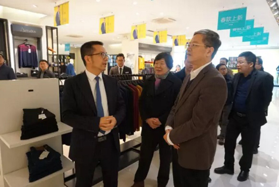 中國紡織工業聯合會副會長夏令敏(左二)、江蘇省紡織工業協會會長謝明(左三)一行在聽取波司登董事局主席高德康介紹企業發展情況。 調研組一行還前往昆承湖紡織服裝電商產業園中服園區、虞山鎮莫城電商園、阿仕頓服飾、波司登集團走訪調研,切實了解各企業的運行情況,并提出相關建議。 在江蘇近些年快速成長為全國知名快時尚男裝品牌的阿仕頓總部,夏令敏向阿仕頓董事長龔政表示,電商和設計是服裝品牌企業要去重點考慮的,特別是抓住市場的設計,才能讓品牌有突出發展的機會。他在形象店中看到阿仕頓的品牌定價,認為這種價格策略是目前中國大眾消費群體所能接受的。走這樣物美價廉的路子,也是中國當下品牌快速發展的先機。 3月3日,調研組又來到盛澤展開調研,走訪了盛虹集團、京奕集團、中國綢都網、宜布網等企業,深入了解了中國東方絲綢市場和盛澤紡織企業落實“互聯網+”、兩化融合方面的基本情況和總體發展水平。