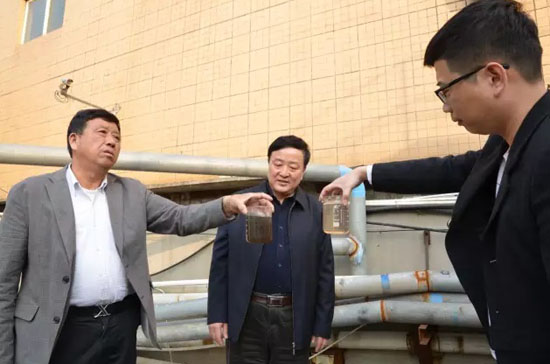 調(diào)研組一行在海天環(huán)境工程公司對廢水和處理后的水進行比較。 海天環(huán)境工程公司承擔著周邊染整企業(yè)的廢水處理工作,在公司監(jiān)測設備上,記者看到經(jīng)過處理過的廢水COD穩(wěn)定在80,完全達到直接排放的標準要求。 |