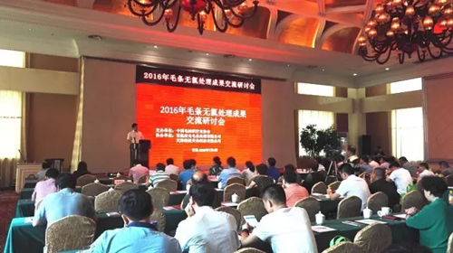這項技術就是由天津綠源天美科技有限公司、天津工業大學、常熟市新光毛條處理有限公司、武漢紡織大學、霸州市濱海東方科技有限公司等單位共同承擔的中國紡織工業聯合會科技指導性項目“生物酶連續式羊毛快速防縮關鍵技術及產業化”。 為加快推廣此項技術的應用,7月6日,中國毛紡織行業協會在江蘇常熟組織召開了“2016年毛條無氯處理成功交流研討會”。江蘇省常熟市副市長周靈群、中國毛紡織行業協會會長黃淑媛、常熟市古里鎮黨委書記曹國芬、常熟市古里鎮副鎮長高平、常熟市新光毛條處理有限公司總經理瞿建德、天津綠源天美科技有限公司總經理張偉民,以及來自行業相關機構和企業的代表參加了會議。 革命性突破體現在哪里?