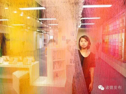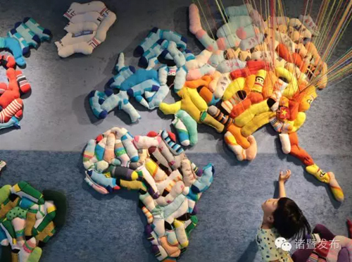 走進(jìn)襪業(yè)智庫展廳,頭頂上方懸掛的五彩襪子像風(fēng)鈴一樣搖曳,整個大廳里都是各種形態(tài)的襪子組合,不禁讓大家感慨,原來襪子也可以是美美的裝飾品。