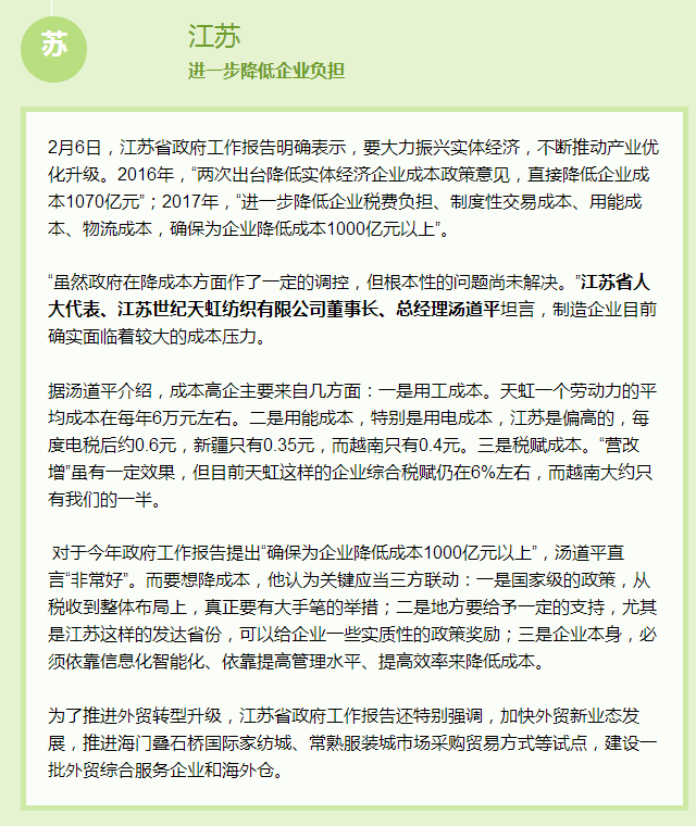| 盤(pán)點(diǎn)各地兩會(huì),江蘇、浙江、廣東等紡織大省都樹(shù)立了哪些促進(jìn)行業(yè)業(yè)發(fā)展小目標(biāo)? |