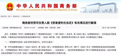 ↑從左至右:盧旺達大使、乍得大使、WTO總干事阿澤維多、約旦大使、阿曼大使明投資的部分公司 2013年12月,在印度尼西亞巴厘島召開的WTO部長級會議取得重大成果,其中一項就是完成了《貿易便利化協定》談判,同意將該協定納入世貿組織規則體系。 目前世貿組織共有164個成員,根據規定,該協定需得到世貿組織三分之二即110個成員批準才能生效實施。 《貿易便利化協定》是世貿組織1995年成立以來達成的首個多邊貿易協定,也是多哈回合談判啟動以來取得的“里程碑式”進展。 《貿易便利化協定》共分為3個部分、24項條款,對加速貨物的放行和流動、提高貿易效率、降低貿易成本等做出了具體規定,包括簡化通關手續并使其標準化,要求海關和其他政府機構開展有效合作,同時充分考慮給予發展中成員和最不發達成員特殊和差別待遇。