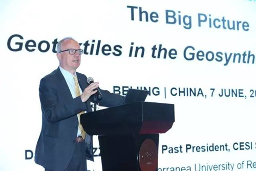 IGS前主席Daniele Cazzuffi在《大視野——土工合成材料中的土工織物》的報(bào)告中,介紹了影響土工合成行為的因素:聚合物類型、制造過(guò)程、邊界條件,和影響服務(wù)條件積極行為的因素:初步實(shí)驗(yàn)、合適的設(shè)計(jì)、正確安裝、充分監(jiān)測(cè)。針對(duì)土工布應(yīng)用中較為突出的加筋功能、過(guò)濾功能,他列舉在意大利Agnano平原北部的火山灰土壤滑坡的案例,介紹了土工布在加筋斜坡的一種應(yīng)用。他說(shuō),“HDPE土工合成材料加筋邊坡的改造,由于更好的環(huán)境整合所以存在了種植植物的可能性”。從河道和運(yùn)河河岸以及海上建筑物的防腐蝕保護(hù)方面,他介紹了土工織物界面的過(guò)濾功能,土工織物過(guò)濾器必須能夠保留其上游側(cè)的土壤細(xì)顆粒(保留標(biāo)準(zhǔn)),并避免過(guò)多的孔隙水壓力的發(fā)展。 Daniele Cazzuffi說(shuō),使用條件和土工織物的耐久性一般非常復(fù)雜。土工布只是復(fù)雜系統(tǒng)的一個(gè)組成部分,土工織物的不正確選擇通常可能導(dǎo)致零件甚至整個(gè)結(jié)構(gòu)的極限狀態(tài)。