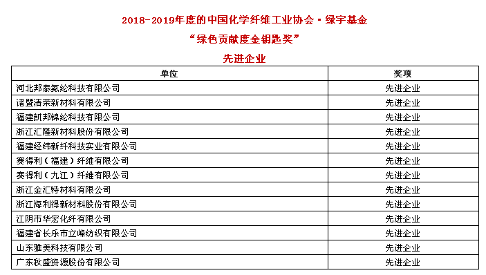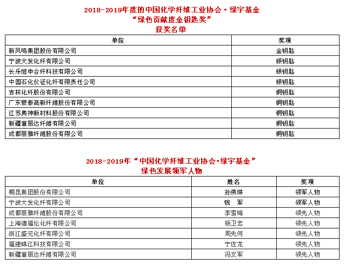 為進一步落實創新、協調、綠色、開放、共享的新發展理念,深化供給側結構性改革,推進化纖行業綠色可持續發展,加快構建科技含量高、資源消耗低、環境污染少的化纖行業綠色制造體系,會上進行了2018-2019年度“中國化學纖維工業協會·綠宇基金”綠色貢獻度金鑰匙獎的表彰活動,授予新鳳鳴集團股份有限公司等九家企業“中國化學纖維工業協會·綠宇基金”綠色貢獻度金鑰匙獎,授予桐昆集團股份有限公司孫燕琳等“中國化學纖維工業協會·綠宇基金”綠色貢獻度金鑰匙獎綠色發展領軍人物及領先人物稱號。獲獎名單如下: