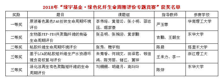 此外,會上同期舉行了2018年“綠宇基金·綠色化纖生命周期評價專題競賽”的表彰活動,活動旨在為行業培養具備低碳綠色意識、掌握低碳綠色評價方法的復合型專業人才,促進院校師生與化纖企業的交流與合作,并推動中國化纖行業LCA標準與數據庫的研究與應用。華南理工大學《原液著色黑色PA6絲襪生命周期環境評價》項目獲得一等獎;東華大學《生物基PEF-PEG共聚酯纖維的制備生命周期評價》、塔里木大學《粘膠纖維生命周期環境評價》項目獲得二等獎;浙江理工大學《基于LCA的粘膠短纖維生產水資源環境負荷核算與評價》、東華大學《活化法再生有色聚酯短纖維的生命周期評價》項目獲得三等獎。