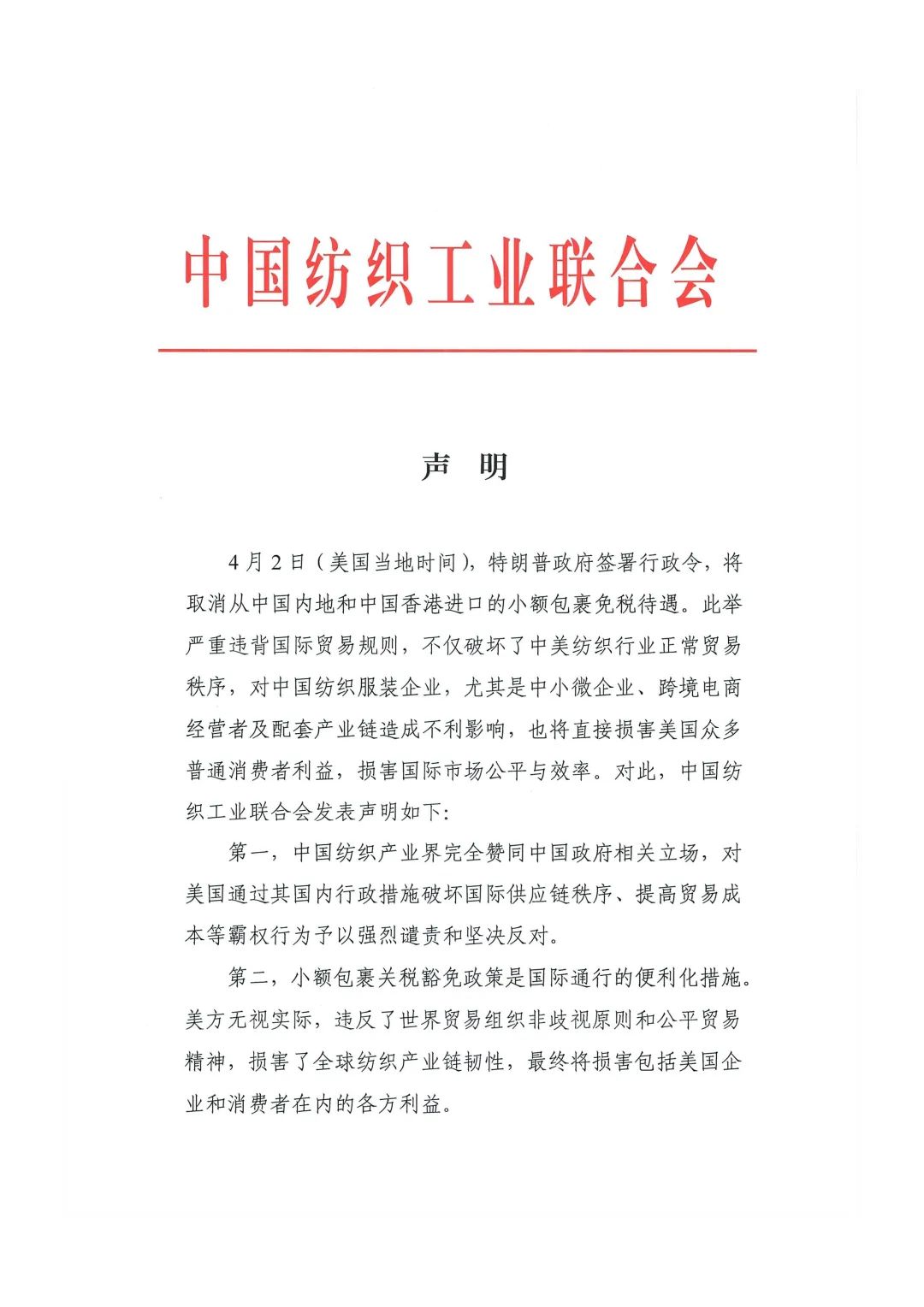 ![]() ![]() 4月2日(美國當地時間),特朗普政府簽署行政令,將取消從中國內地和中國香港進口的小額包裹免稅待遇。此舉嚴重違背國際貿易規則,不僅破壞了中美紡織行業正常貿易秩序,對中國紡織服裝企業,尤其是中小微企業、跨境電商經營者及配套產業鏈造成不利影響,也將直接損害美國眾多普通消費者利益,損害國際市場公平與效率。對此,中國紡織工業聯合會發表聲明如下: