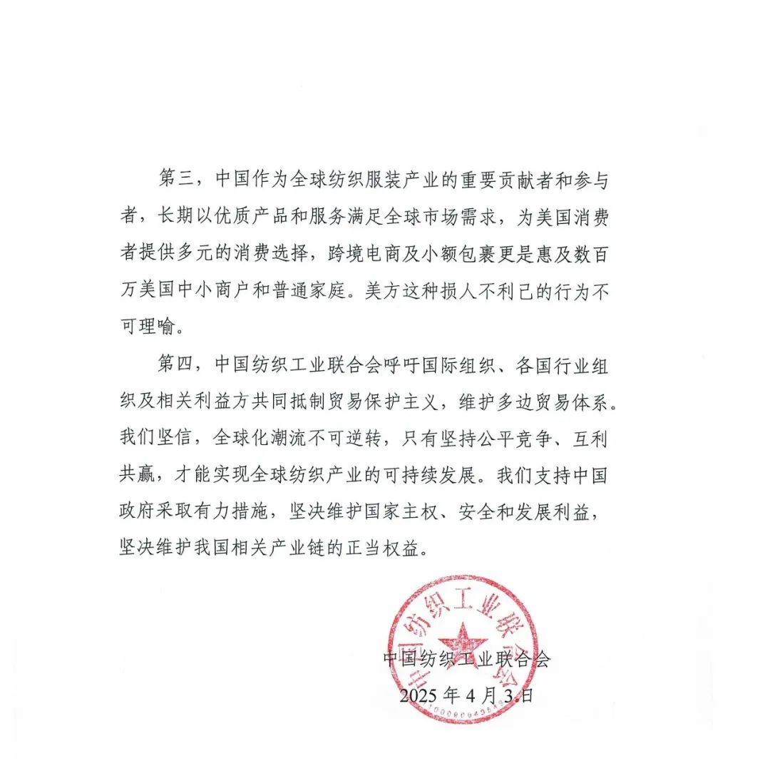 第四,中國紡織工業聯合會呼吁國際組織、各國行業組織及相關利益方共同抵制貿易保護主義,維護多邊貿易體系。我們堅信,全球化潮流不可逆轉,只有堅持公平競爭、互利共贏,才能實現全球紡織產業的可持續發展。我們支持中國政府采取有力措施,堅決維護國家主權、安全和發展利益,堅決維護我國相關產業鏈的正當權益。