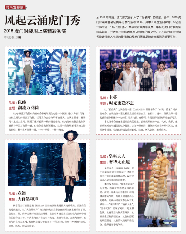 本刊記者-劉嘉 從2014年開始,虎門服交會引入了“時裝周”的概念。今年,2016虎門時裝周主會場共舉行發布活動14場,其中8場企業品牌秀,5場設計師專場,1場“虎門杯”女裝設計大賽總決賽。年輕的虎門時裝周堅持高起點,并依托已經成功舉辦20余年的服交會,正在成為國內外知名設計師進入市場的最佳窗口及虎門服裝品牌走向國際的重要平臺。