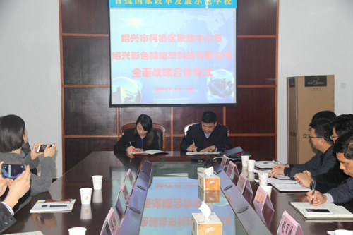 趙國玲 文/攝 近日,紹興市柯橋區職業教育中心與紹興彩色櫞紡織科技有限公司全面戰略合作簽約儀式在職教中心會議室舉行。柯橋區教體局副局長倪國興、中國輕紡城創意產業中心副主任張珊珊、職業教育中心校長趙百源、彩色櫞紡織科技董事長盛素英等相關部門、企業領導出席了此次簽約儀式。