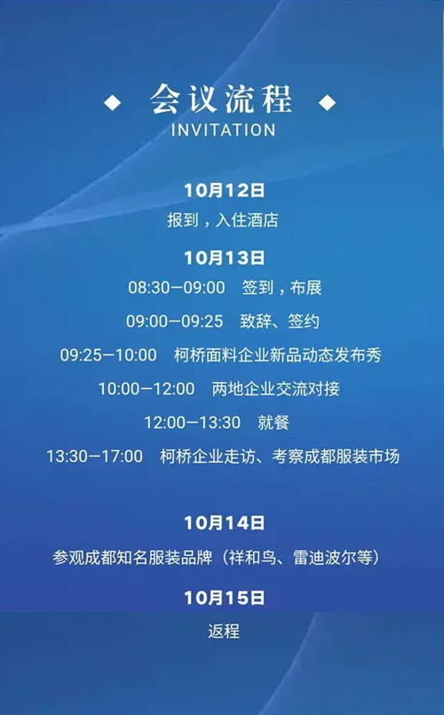 10月13日,“絲路柯橋·布滿全球”——走進成都對接會將在成都舉行。 屆時,柯橋30家優質面料企業與成都100余家知名服裝品牌、服裝設計師工作室進行深度精準對接。 本次活動旨在暢通“內循環”產業鏈,助力兩地企業強強合作,拓展更廣闊的銷售渠道。現場將通過時尚走秀、產品對接等多種形式,拓展紹興和成都兩地紡織產業供應鏈上下游之間的合作交流與發展空間。 在以“內循環”為主的新格局下,讓我們守望相助,乘風破浪! ![]()