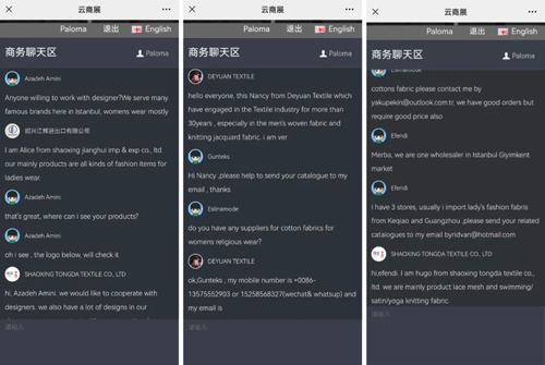 ![]() ![]() Eslinamode, CSW kids, Halil Bey, Elite plus等百家服裝、配飾及家紡品牌與貿(mào)易公司的采購(gòu)商代表上線觀看了直播,并通過(guò)實(shí)時(shí)在線交流、即時(shí)洽談、郵件調(diào)樣等在線上進(jìn)行充分互動(dòng)。