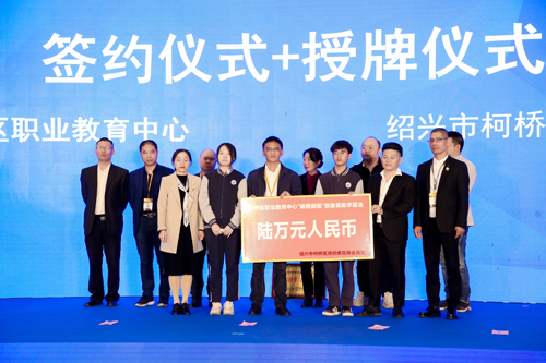 作為本次論壇的重頭戲,現場還舉行了助學儀式,紡織繡花商會在紹興市柯橋區職業教育中心設立“錦繡前程”創意學生獎助金項目,雙方代表簽署助學捐贈協議,捐助6萬元,幫助并鼓勵優秀學生和困難學生更好、更有條件地完成學業。校長鐘健康現場代表學校,授予商會“愛心助學、領軍行業”資助榮譽牌匾,支持紹興柯橋紡織繡花行業創新人才的培育計劃。