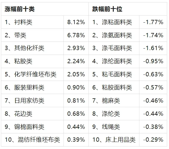 據監測,本期服飾輔料類價格指數收報于131.05點,環比上漲2.37%,較年初下跌0.44%,同比下跌1.27%。其中:襯料類、帶類、服裝里料類、花邊類行情明顯回升,價格指數呈環比上漲走勢。