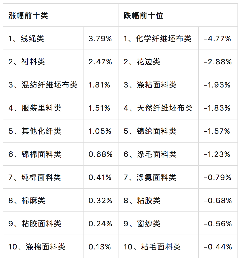 據監測,本期服裝面料類價格指數收報于115.94點,環比下跌0.15%,較年初下跌0.44%,同比下跌0.37%。其中:滌綸面料、滌毛面料、滌粘面料、滌錦面料、滌氨面料、粘毛面料、錦綸面料、麻粘面料成交價量不等量下跌,價格指數環比下跌。
