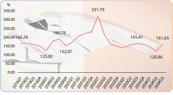 2024年三季度,在新花型推出數強勢增長的帶動下,時尚創意指數扭轉跌勢,低位抬升,收于161.65點,環比漲幅33.75%。