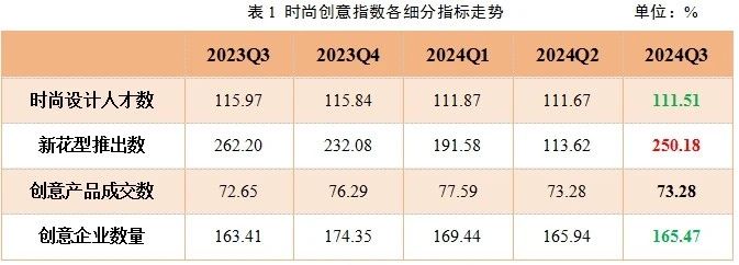 2024年三季度,四項細分指數表現為“一漲一平兩跌”。其中,新花型推出數指數大幅上漲,創意產品成交數指數環比持平,時尚設計人才數和創意企業數量兩項指數小幅下滑。