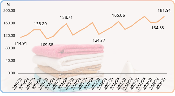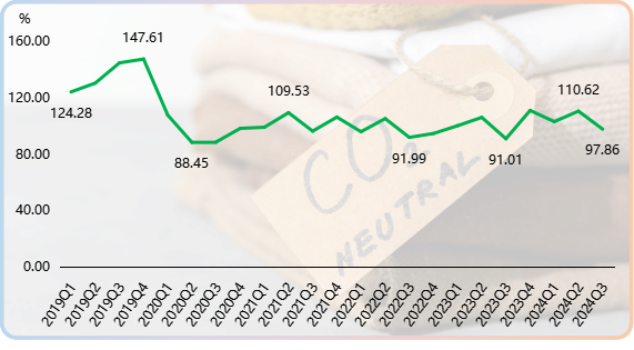 2024年三季度,時尚評價指數止跌上揚,收于130.11點,環比和同比分別上漲5.35%和2.59%。時尚評價指數自2023年三季度開始向上爬升,截至今年一季度已實現連續三個季度的上漲,二季度指數有所回調,三季度再度攀升至較高水平運行。