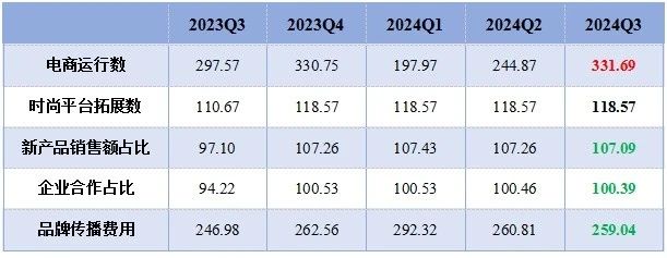 2024年三季度,五項細分指數表現為“一漲一平三跌”。其中,電商運行數指數突破性向上爬升,創歷史新高;時尚平臺拓展數保持在118.57點平穩運行;新產品銷售額占比、企業合作占比和品牌傳播費用三項指數同步小幅下滑。