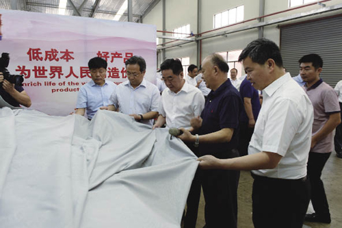 宿遷市市委書記張愛軍(左三),市長王昊(左二)在沭陽縣委書記、經開區黨工委書記卞建軍(右一),縣長彭偉(左一)的陪同下調研沭陽經開區紡織企業。 TAweekly:當下,中美貿易摩擦對出口型紡織企業帶來了一定影響,您認為企業與政府應該從哪些方面努力來抵御危機? 石敬峰:中美貿易摩擦對沭陽紡織產業影響相對較小,這可以從相關數據得到驗證。今年1~10月份,沭陽紡織產業實現開票銷售收入同比增長高達46%,可以說是沭陽近幾年發展較快的一年。 為抵御中美貿易摩擦帶來的影響,從企業角度來講,俗話說,“打鐵還需自身硬”,企業還是要加大自主創新力度,提高產品競爭力,提升企業在行業內的話語權,而且須有全球化的視野,搶抓國家“一帶一路”契機,統籌做好國外國內兩個市場。此外,還須充分吸收先進企業的管理經驗,加強內部管理,降低各種成本,提高產品的市場占有率。 從政府角度講,當前經濟下行壓力加大,許多企業經營有壓力有煩惱、有困難有訴求,諸如市場的冰山、融資的高山和轉型的火山“三山”問題,用工荒、用錢荒、用地荒,成本高、稅費高、利潤低的“三荒兩高一低”問題以及政府服務存在的玻璃門、彈簧門、旋轉門等問題,這些企業迫切希望得到方方面面的溫暖和關心。作為政府,在服務企業時務必情感上要貼近、工作上要務實、力度上要精準,把客商當好朋友、好搭檔,不管份內、份外事,都當作是自己的事,政策之內全力幫,實行“保姆式”與“月嫂式”服務相結合,保姆式服務的就是普惠,月嫂式服務的就是點對點,多為企業送“快餐”、開“小灶”、獻“偏方”,以“繡花功夫”實現招招“點穴”,讓企業少走“彎路”、少添煩惱、少增壓力,堅定企業對市場的信心,充分激活他們的發展新動能。