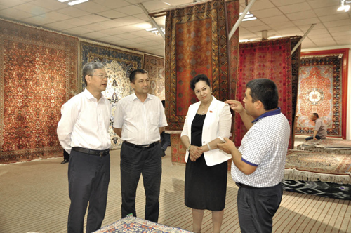 夏令敏(左一)詳細詢問手工地毯市場銷路情況。 和田地區