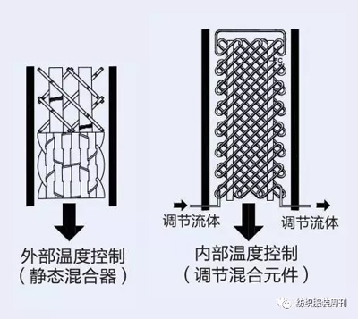 二是混合元件。在特別優(yōu)選的實施方案中,根據(jù)ONE-A的系統(tǒng),熱交換器管道系統(tǒng)包含內(nèi)部的混合組件,至少一段管道或熱交換器。 一種可行的方法為安裝內(nèi)部混合組件,與在雙層夾套聚合物管道殼體內(nèi)的外部冷卻(或調(diào)節(jié))相結合。混合組件被用來旋動流體以此使層流轉變?yōu)橥牧鞑ⅲɑ颍臒峤粨Q器中心到截面的外部區(qū)域形成一個流體交換。熱交換僅發(fā)生在(冷卻的)管壁和與(冷卻的)管壁臨時直接接觸的打旋的聚合物之間。 混合組件也可以部分或獨立的熱交換器形式提供,帶有內(nèi)部混合和內(nèi)部溫度控制。 根據(jù)實例,與熱交換器管道系統(tǒng)相關的發(fā)明,是一個混合組件與溫度控制方式的結合,譬如,以在熱交換器內(nèi)部的傳熱介質(zhì)管道的形式。這可以通過對一個傳熱介質(zhì)管道進行相應形狀的纏繞實現(xiàn)。為了防止壓力損失產(chǎn)生的摩擦熱,傾向于選擇較低的填料密度。