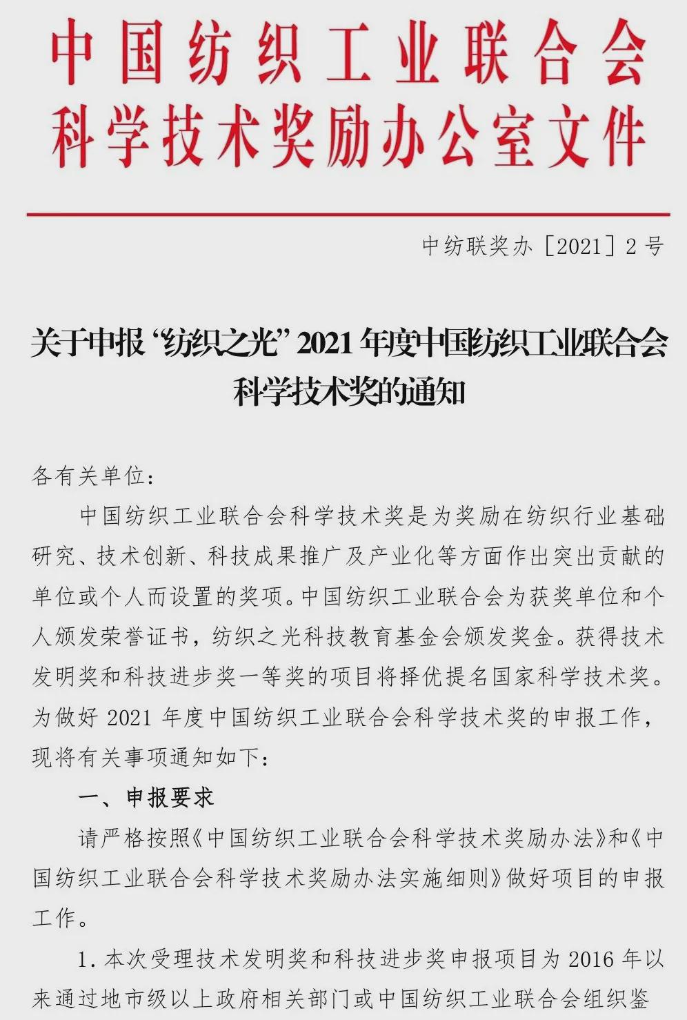 “紡織之光” 2021年度中國紡聯科技獎開始申報