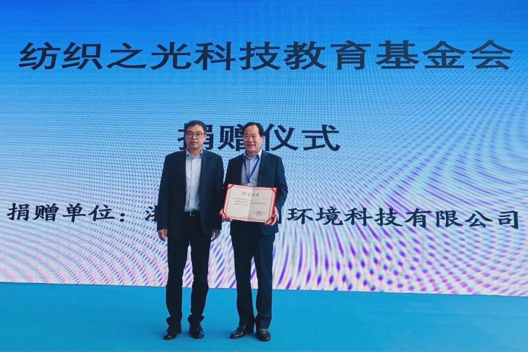 會上,紡織之光科技教育基金會向捐贈單位浙江金佰利環境科技有限公司頒發“紡織之光”捐贈證書。