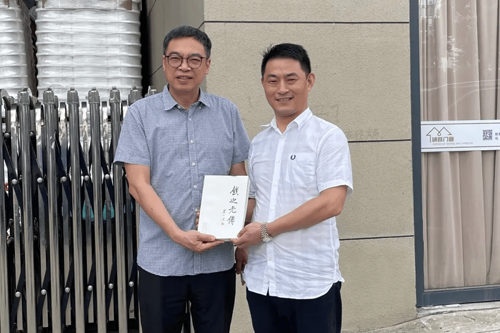 ![]() 葉志民向海寧市栩通新材料有限公司總經理潘益森贈送《錢之光傳》 |